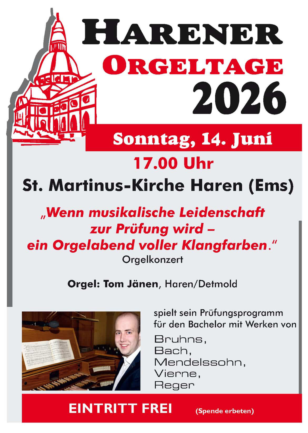 Im Rahmen der Harener Orgeltage findet am Sonntag, den 14. Juni 2026, ein stimmungsvoller Orgelabend in der St.-Martinus-Kirche Haren (Ems) statt.
