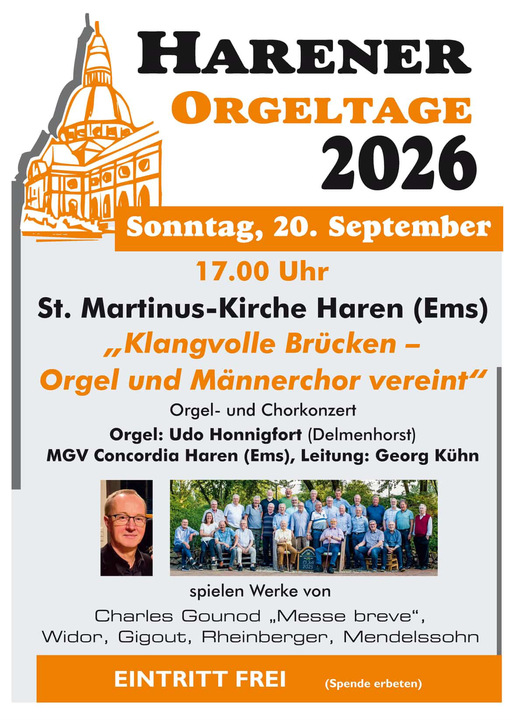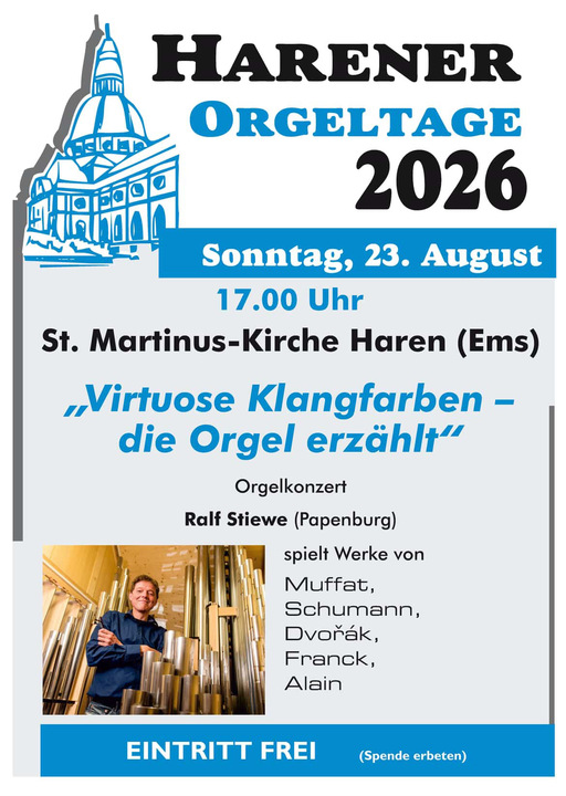 Am Sonntag, den 23. August 2026, geht es mit den Harener Orgeltagen in der St.-Martinus-Kirche Haren (Ems) weiter. Der Organist Ralf Stiewe (Papenburg) gestaltet einen Konzertabend mit virtuoser Orgelmusik. Auf dem Programm stehen beeindruckende Klangwelten und abwechslungsreiche Stücke, die die...